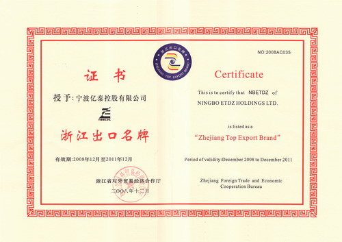關(guān)于我公司NBETDZ品牌被認定為浙江出口名牌的通知