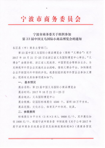 寧波市商務(wù)委關(guān)于組織第23屆中國義烏國際小商品博覽會(huì )的通知
