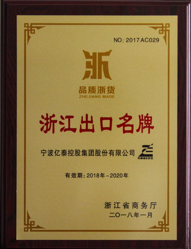 億泰公司在2018年4月26日獲得了“浙江出口名牌”榮譽(yù)稱(chēng)號。自2008年,億泰公司已連續多次獲得該項榮譽(yù)稱(chēng)號。