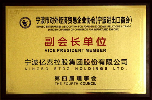 近日,寧波億泰控股集團股份有限公司再次被授予寧波市對外經(jīng)濟貿易企業(yè)協(xié)會(huì )(寧波進(jìn)出口商會(huì ))副會(huì )長(cháng)單位,億泰公司總經(jīng)理陳偉明再次被聘請為寧波市對外經(jīng)濟貿易企業(yè)協(xié)會(huì )(寧波進(jìn)出口商會(huì ))副會(huì )長(cháng)。